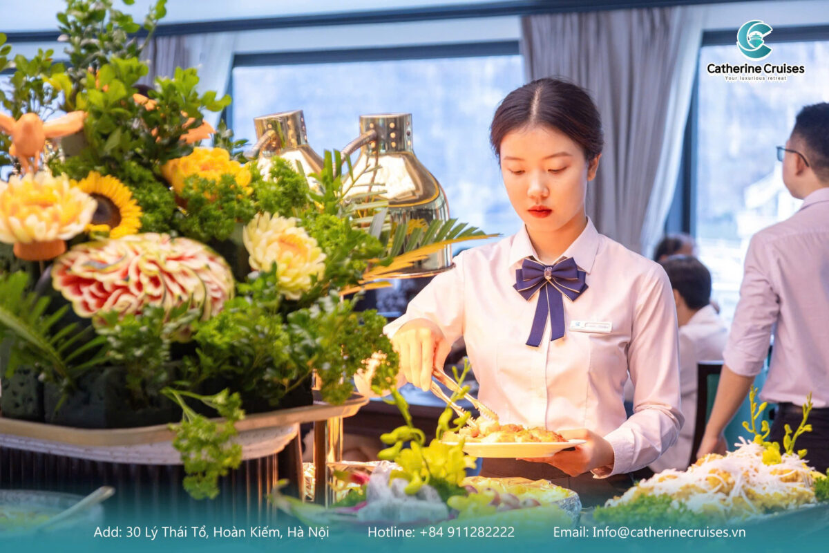Bên cạnh ẩm thực đẳng cấp, du thuyền Catherine còn nổi bật bởi phong cách phục vụ tận tâm và chuyên nghiệp. Đội ngũ nhân viên luôn sẵn sàng hỗ trợ, mang đến cho bạn cảm giác thoải mái và tiện nghi nhất trong suốt hành trình. Từng chi tiết nhỏ trong bữa tiệc, từ cách bày trí món ăn đến thái độ phục vụ của nhân viên, đều được chăm chút kỹ lưỡng, đảm bảo mang đến sự hài lòng tối đa cho mọi thực khách.